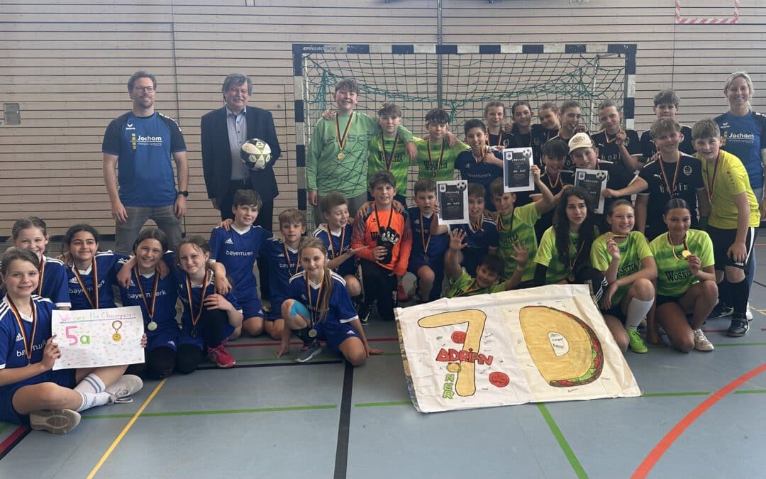 Viele Lehrer, Lehrerinnen und selbst die gesamte Schulleitung kamen zum Turnier und feuerten ihre Comenianer an. Bei der Siegerehrung ließ es sich Direktor Herr Scharnagl nicht nehmen, allen Teams zu gratulieren und Urkunden auszuhändigen. Frau Bauer übernahm das Küren mit den Sieger-Medaillen. Besonders in den 5. und 6. Klassen waren es sehr knappe Spielergebnisse, weshalb der erste Platz durch ein Sieben-Meter-Schießen ermittelt werden musste. Zeitgleich wurde auf beiden Spielfeldern geschossen, Tränen und Freude waren eng beinander. Schlussendlich durften die „a-ler“ jubeln: Sowohl die 5a als auch die 6a konnte den Sieg vom Punkt für sich entscheiden und sich zum Turniersieger küren. Zu dem Song „We are the champions“ gratulierte man in der 7. Jahrgangsstufe besonders der Klasse 7d, die zum dritten Mal in Folge den Sieg erringen konnte und somit besonders großen Applaus erntete.