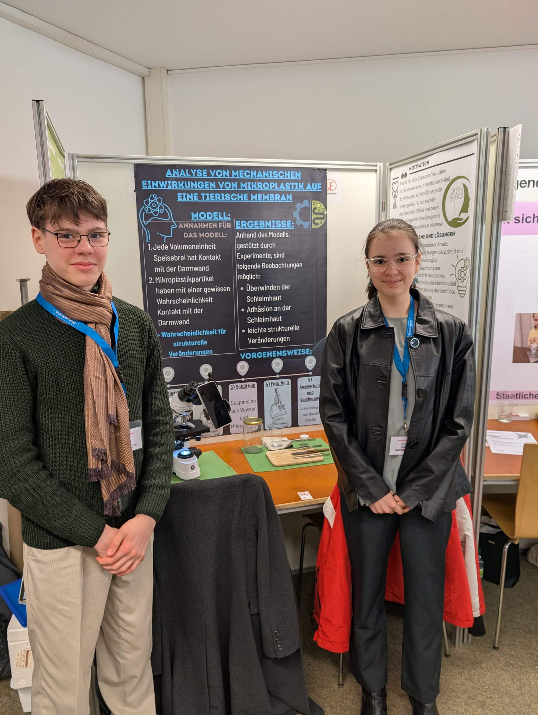Besonders erfolgreich war das Geschwisterpaar Amelie und Cedric Hippeli. In ihrer Arbeit untersuchten sie die Membrandurchlässigkeit von Biomembranen für Mikroplastik. Mithilfe eines Schweinedarmmodells konnten sie zeigen, unter welchen Bedingungen Mikroplastikpartikel biologische Membranen passieren könnten. Für diese Arbeit wurden sie mit dem ersten Preis in der Kategorie „Jugend forscht junior“ im Fachbereich Biologie ausgezeichnet.