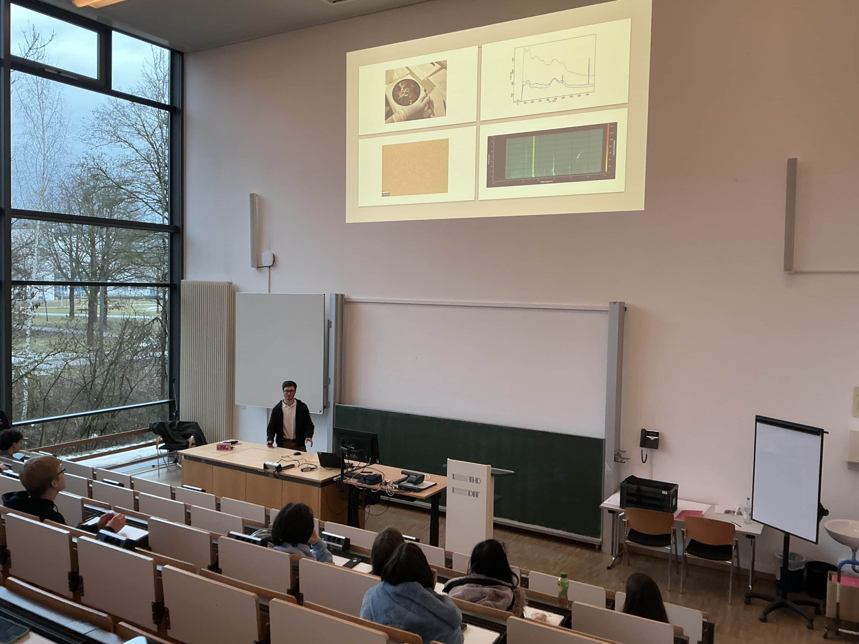 Nach den begrüßenden Worten von Prof. Dr. Martina Heigl-Murauer, die besonders das Engagement und den Einsatz der Frühstudierenden hervorgehoben hat, stellten zwei Schüler die neuen Erfahrungen an der THD sehr anschaulich dar. Anschließend hatten die WTO-Teilnehmenden Andreas Schaffhauser, Leopold Herzog und Roxane Geranmayeh die Gelegenheit, das Entstehen ihrer Seminararbeit in Kooperation mit der THD vorzustellen. Andreas Schaffhauser berichtete dabei von der Herstellung von Hochtemperatursupraleitern im Technologie-Campus Teisnach, Leopold Herzog von den Möglichkeiten der Topologieoptimierung mit Hilfe professionaler Software und Roxane Geranmayeh von der Gestaltung eines Achtsamkeitsworkshops für zwei Schulklassen. Nach diesem interessanten Einblick in die großartigen Arbeiten der Schülerinnen und Schüler erhielten alle Teilnehmer des Frühstudiums noch ein offizielles Zertifikat für die erfolgreiche Teilnahme und durften auch schonmal einen Doktorhut anprobieren. Das anschließende „Get Together“ mit Sandwiches, Getränken und interessanten Gesprächen zwischen Schülern und Lehrenden rundete die Veranstaltung ab.
