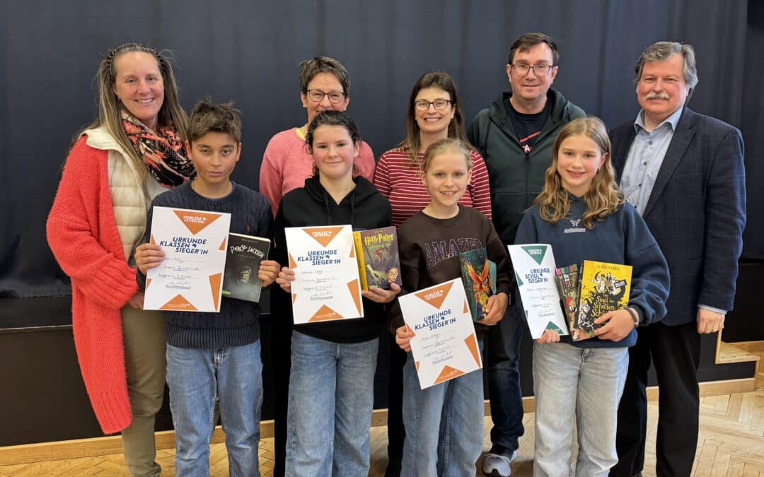 Am 4.12.2025 war es wieder so weit: Es sollte der beste Vorleser bzw. die beste Vorleserin aller sechsten Klassen ermittelt werden. Dabei traten die Klassensieger Karolin Niedermyer (6a), Pedro Fink (6b), Valentina Strobl (6c) und Paula Scheßl (6d) gegeneinander an. Es war klar, dass auf die Jury, die sich aus den jeweiligen Deutschlehrern, der Fachbetreuerin sowie dem Schulleiter zusammensetzte, eine schwierige Aufgabe wartete. Der erste Durchgang bestand darin, einen selbstgewählten vorbereiteten Text möglichst gut vorzutragen, eine Aufgabe, die alle vier Vorleser mit Bravour meisterten. Erst im zweiten Durchgang, als es darum ging, einen unbekannten Textauszug aus Sergio Dudlis Roman „Creepy Chronicles“ ausdrucksstark vorzutragen, konnte sich Karolin Niedermayer aus der Klasse 6a mit nur einem Punkt Vorsprung gegen ihre Konkurrenz durchsetzen. Als Anerkennung für ihre Leistungen erhielt jeder Vorleser eine Urkunde und einen Buchpreis, der von der Buchhandlung Pustet gestiftet wurde. Carolin wird unsere Schule im Februar beim Kreisentscheid vertreten. Wir wünschen ihr viel Erfolg.