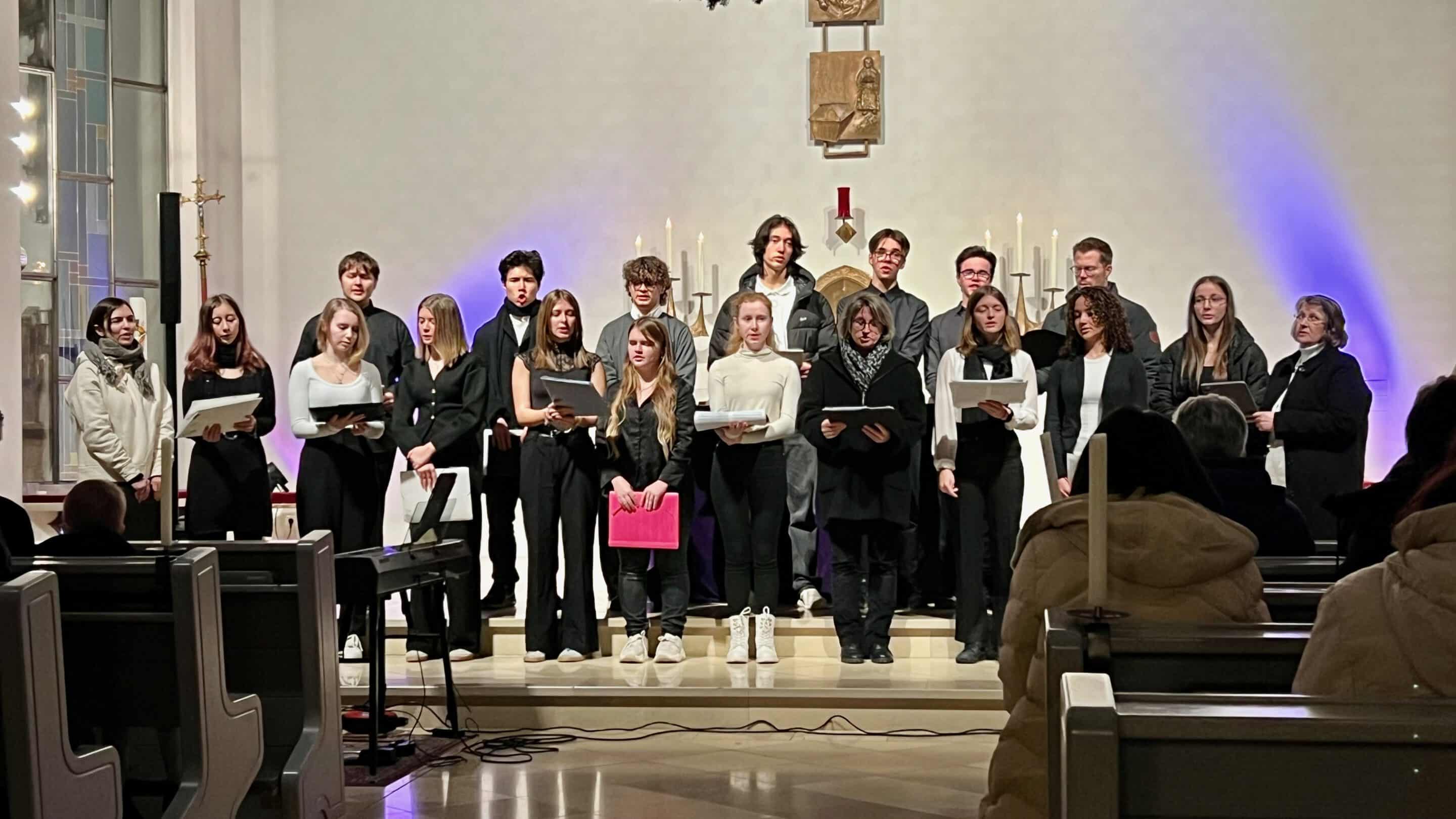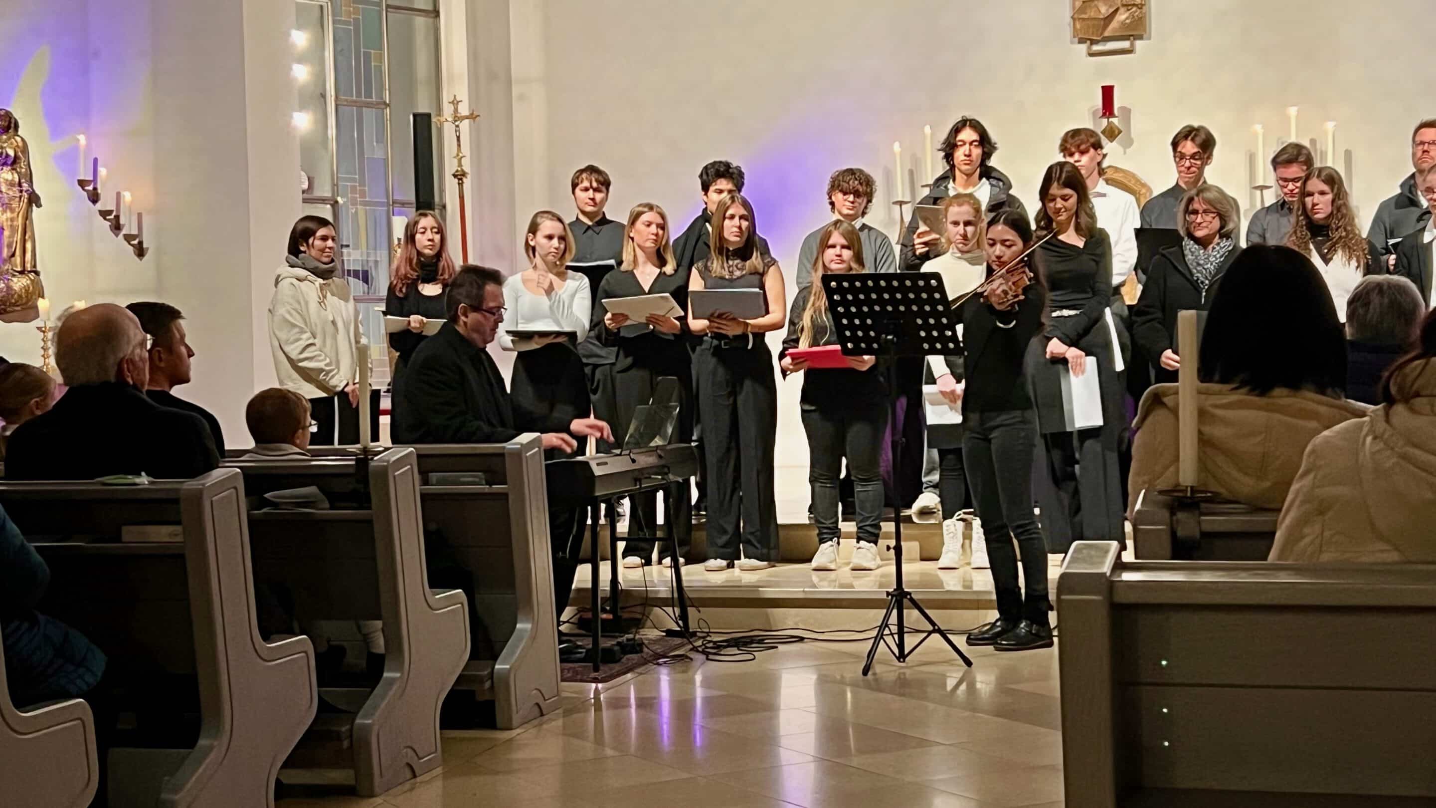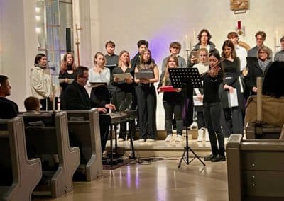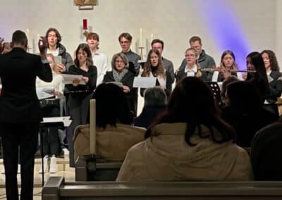Eröffnet wurde der Abend mit Bachs virtuos-festlicher „dorischen“ Toccata mit Herbert Hutterer an „seiner“ Orgel. Pfarrer Thomas Gleißner begrüßte die zahlreichen Konzertbesucher mit einer thematisch passenden Geschichte eines Engels vor Weihnachten. Anschließend versammelten sich die rund 20 jungen Sängerinnen und Sänger mit ihrem Chorleiter und Musiklehrer Max Deml im stimmungsvoll beleuchteten Altarraum. Mit einem international ausgerichteten und oft englischsprachigen Programm leuchtete der Kammerchor das Weihnachtsfest in verschiedenen Stilen und Facetten aus. Von cool-swingenden Songs wie „News in Bethlehem Town“ über „Calypso Gloria“ im afro-karibischen Stil bis hin zu Roger Emersons „Psallite“ mit modern-progressiven Chorklängen füllten die jungen und doch gar nicht zaghaften Stimmen den Kirchenraum. Teils sangen sie intonationssicher ohne Begleitung „A Capella“, teils wurden sie von Herbert Hutterer – ebenfalls Musiklehrer am Comenius – am Klavier begleitet.