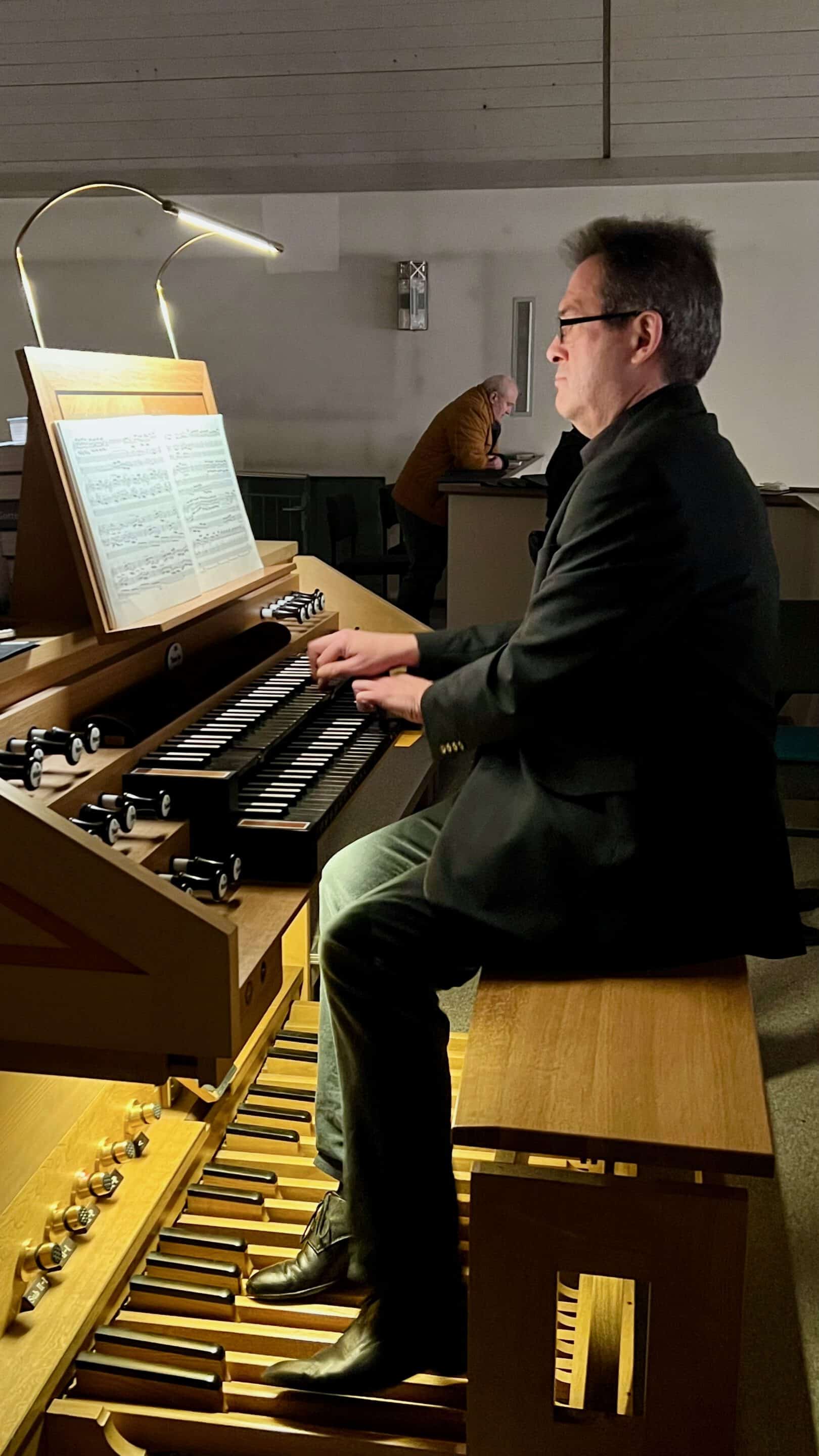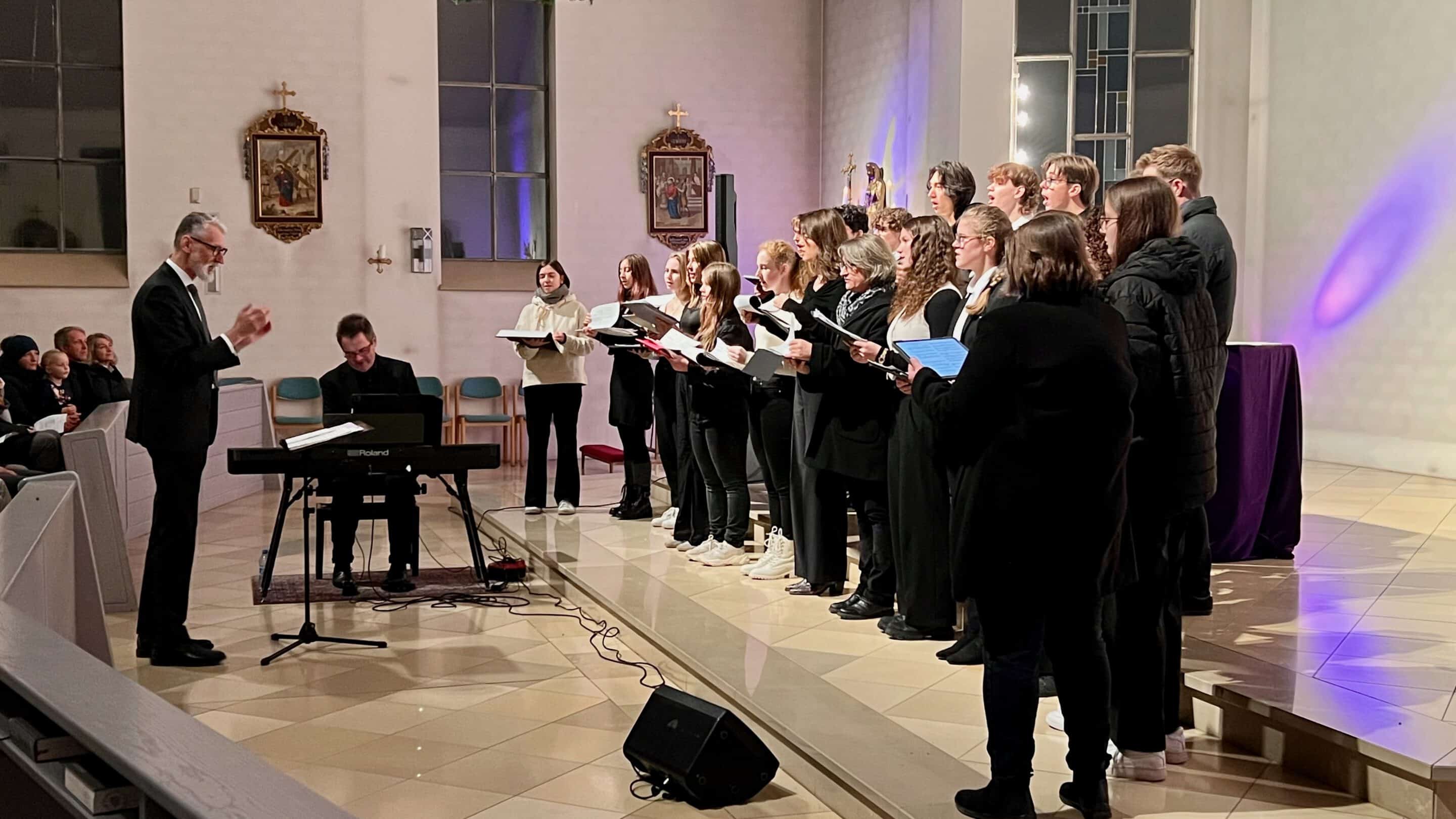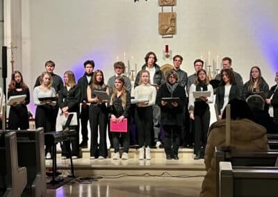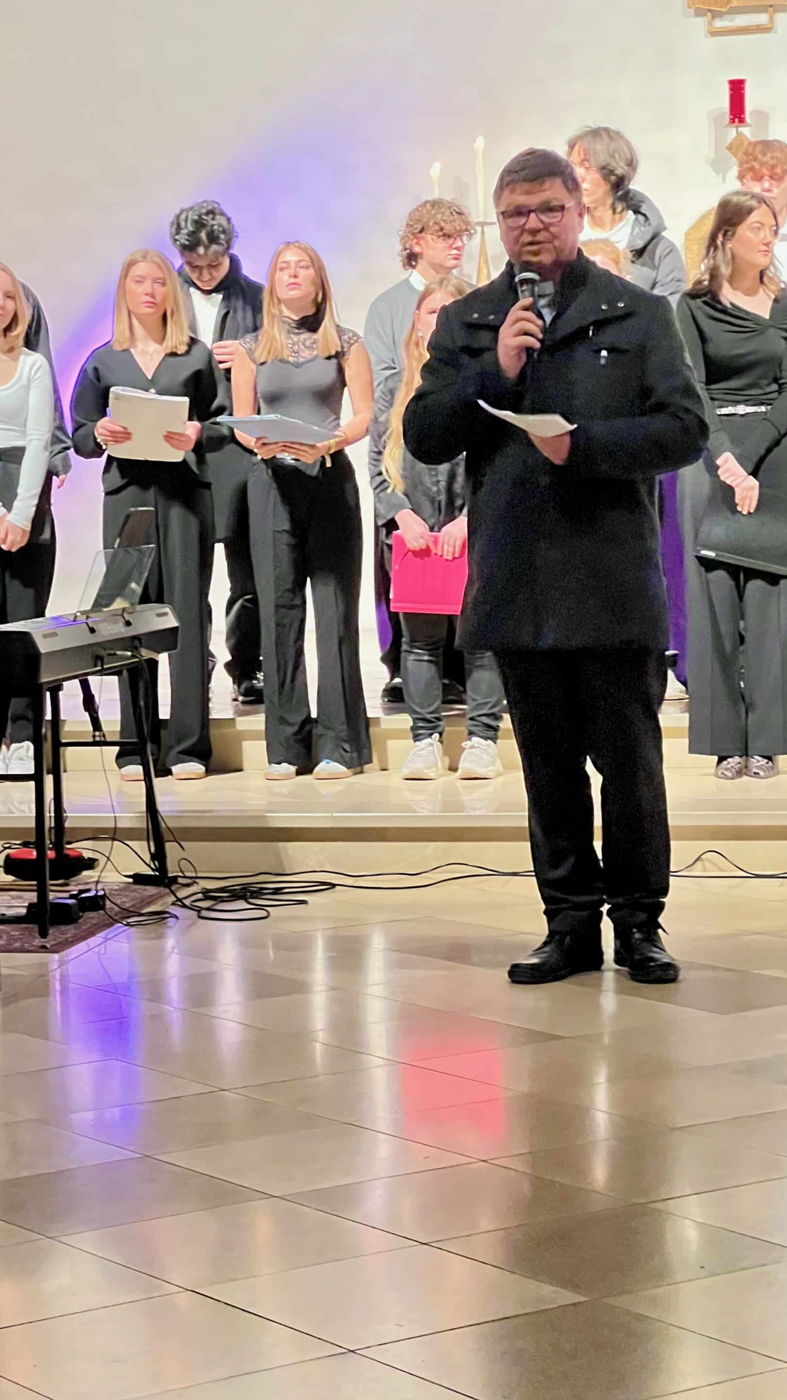 Eröffnet wurde der Abend mit Bachs virtuos-festlicher „dorischen“ Toccata mit Herbert Hutterer an „seiner“ Orgel. Pfarrer Thomas Gleißner begrüßte die zahlreichen Konzertbesucher mit einer thematisch passenden Geschichte eines Engels vor Weihnachten. Anschließend versammelten sich die rund 20 jungen Sängerinnen und Sänger mit ihrem Chorleiter und Musiklehrer Max Deml im stimmungsvoll beleuchteten Altarraum. Mit einem international ausgerichteten und oft englischsprachigen Programm leuchtete der Kammerchor das Weihnachtsfest in verschiedenen Stilen und Facetten aus. Von cool-swingenden Songs wie „News in Bethlehem Town“ über „Calypso Gloria“ im afro-karibischen Stil bis hin zu Roger Emersons „Psallite“ mit modern-progressiven Chorklängen füllten die jungen und doch gar nicht zaghaften Stimmen den Kirchenraum. Teils sangen sie intonationssicher ohne Begleitung „A Capella“, teils wurden sie von Herbert Hutterer – ebenfalls Musiklehrer am Comenius – am Klavier begleitet.