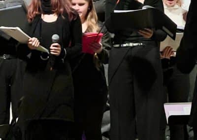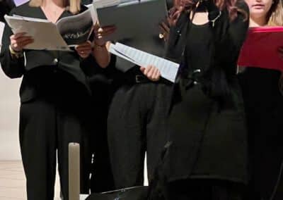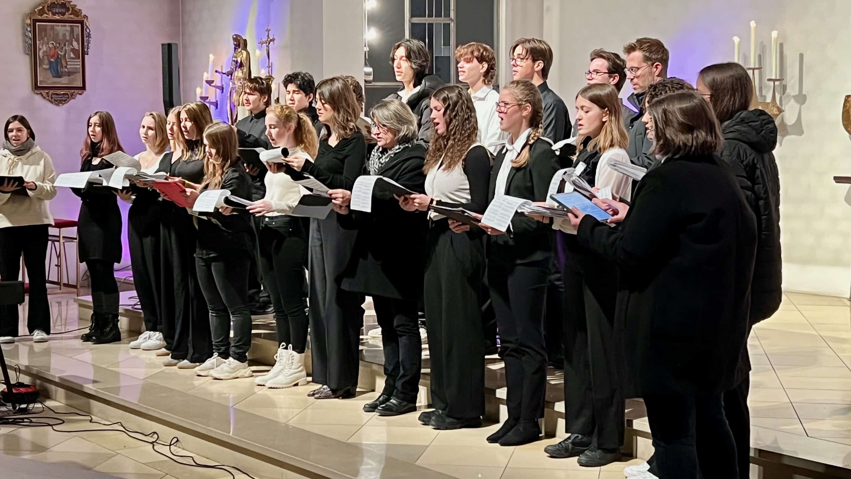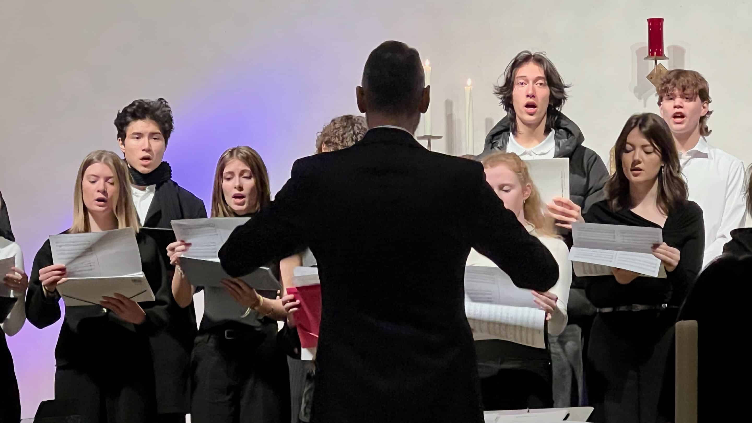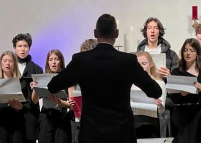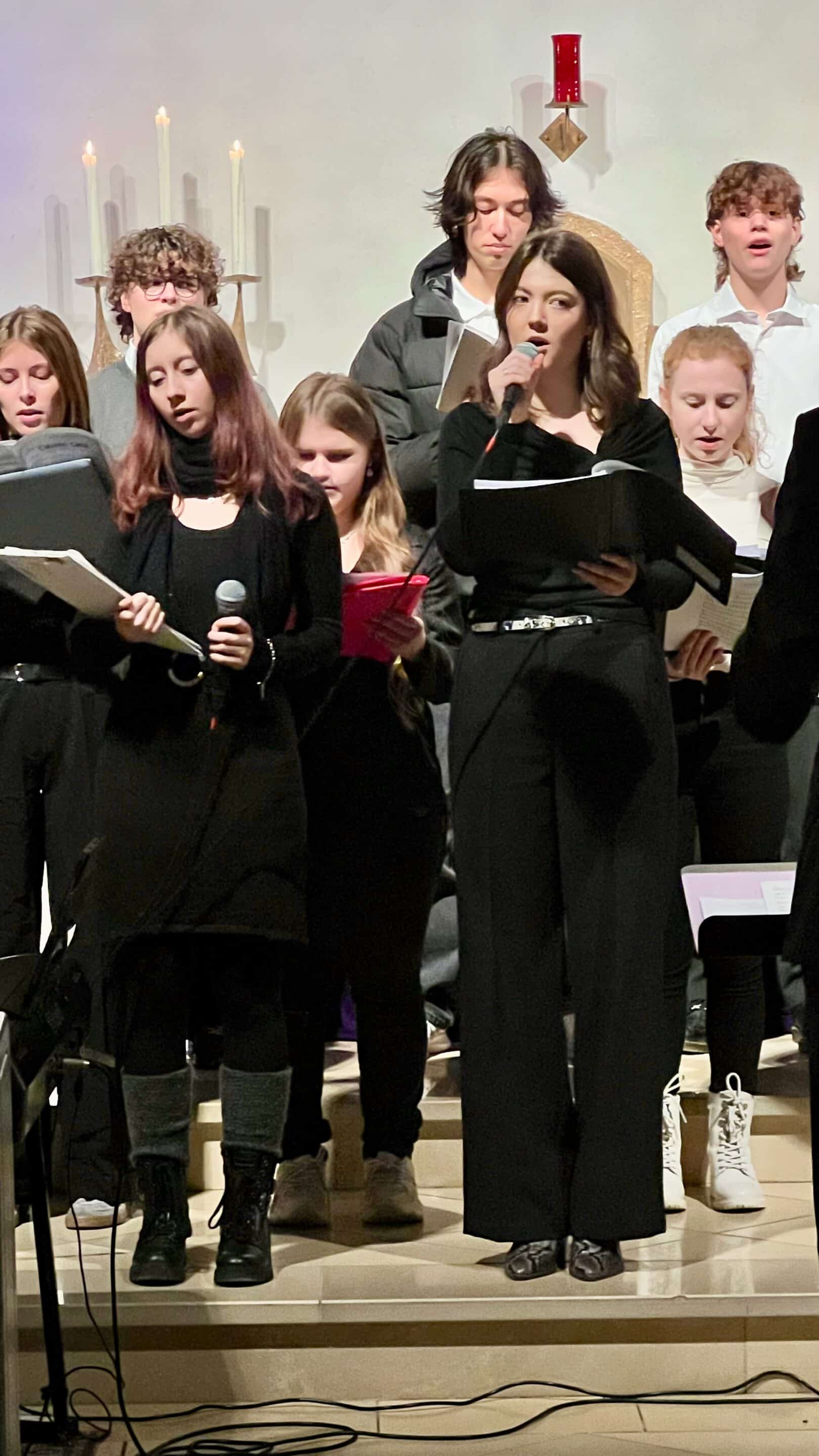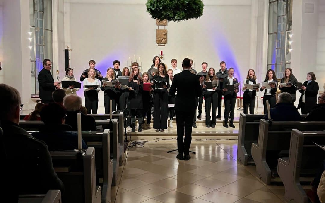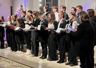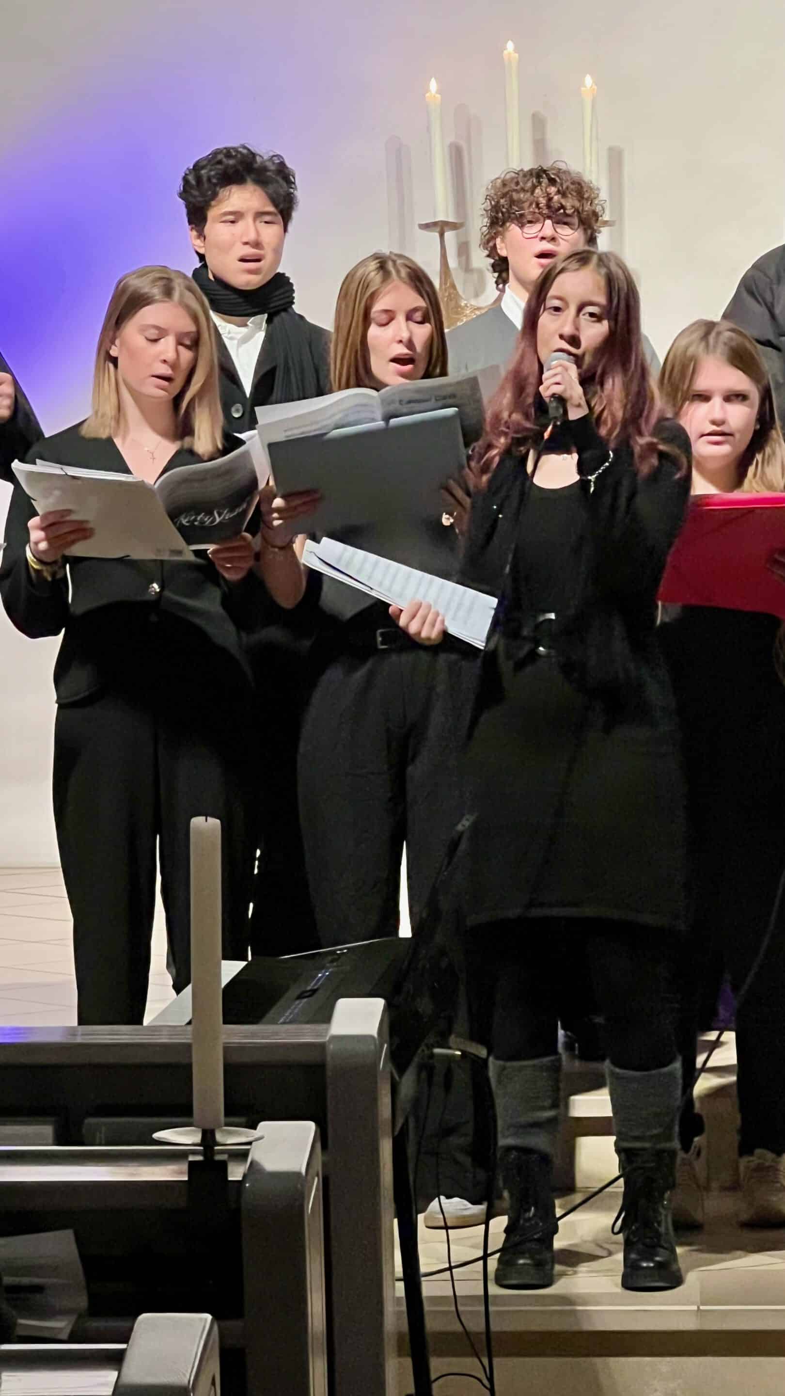 In den folgenden Sätzen führte Max Deml mit seinem präzise-animierenden Dirigat den Kammerchor vom „Bethlehem Spiritual“ über „And the Angels sang“ (das Motto des Konzerts) bis hin zum traditionellen ukrainischen „Carol of the Bells“, das in einem schwungvoll-jazzig Arrangement erklang. Im mitreißenden „Calypso Carol“ zeigten Lina Zeitzler und Lara Gerber als Solistinnen, welch stimmliches Potential in ihnen steckt.