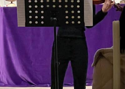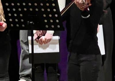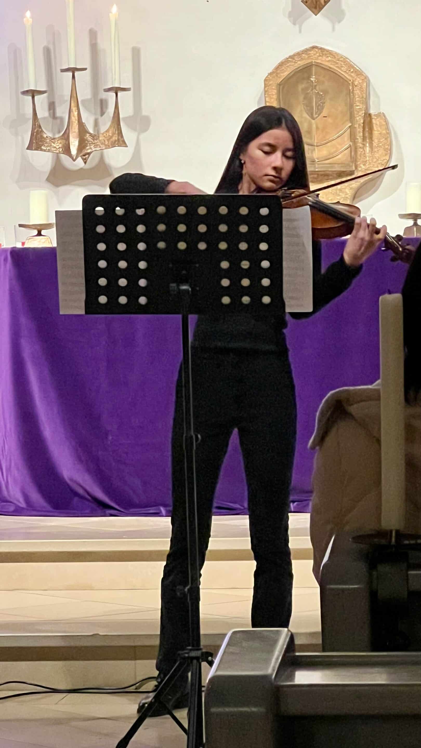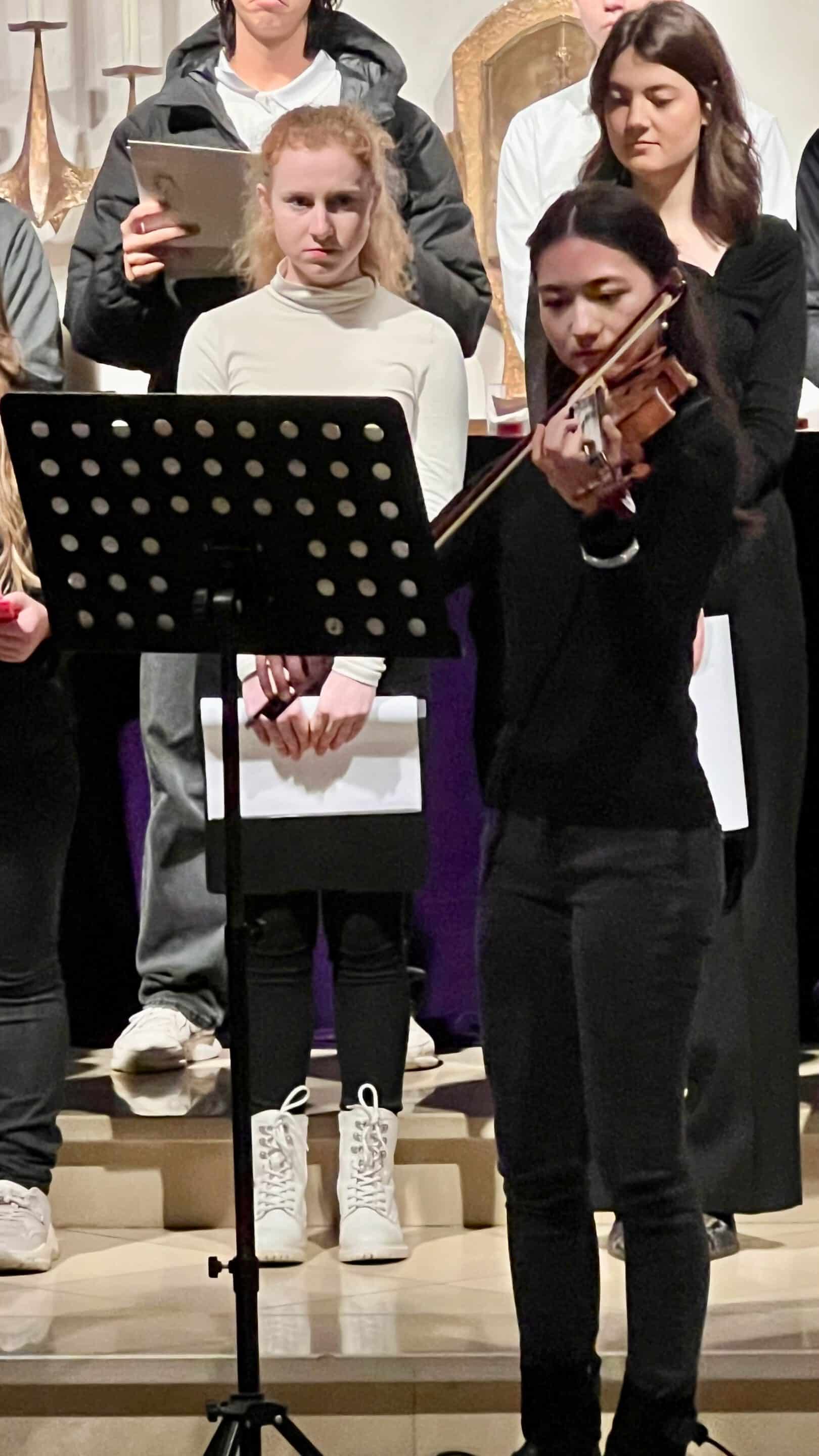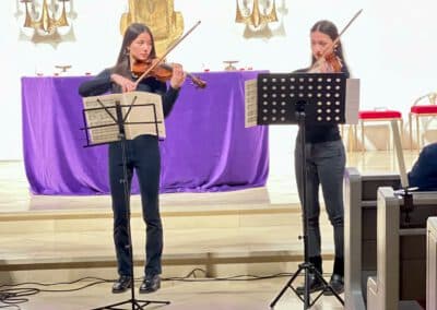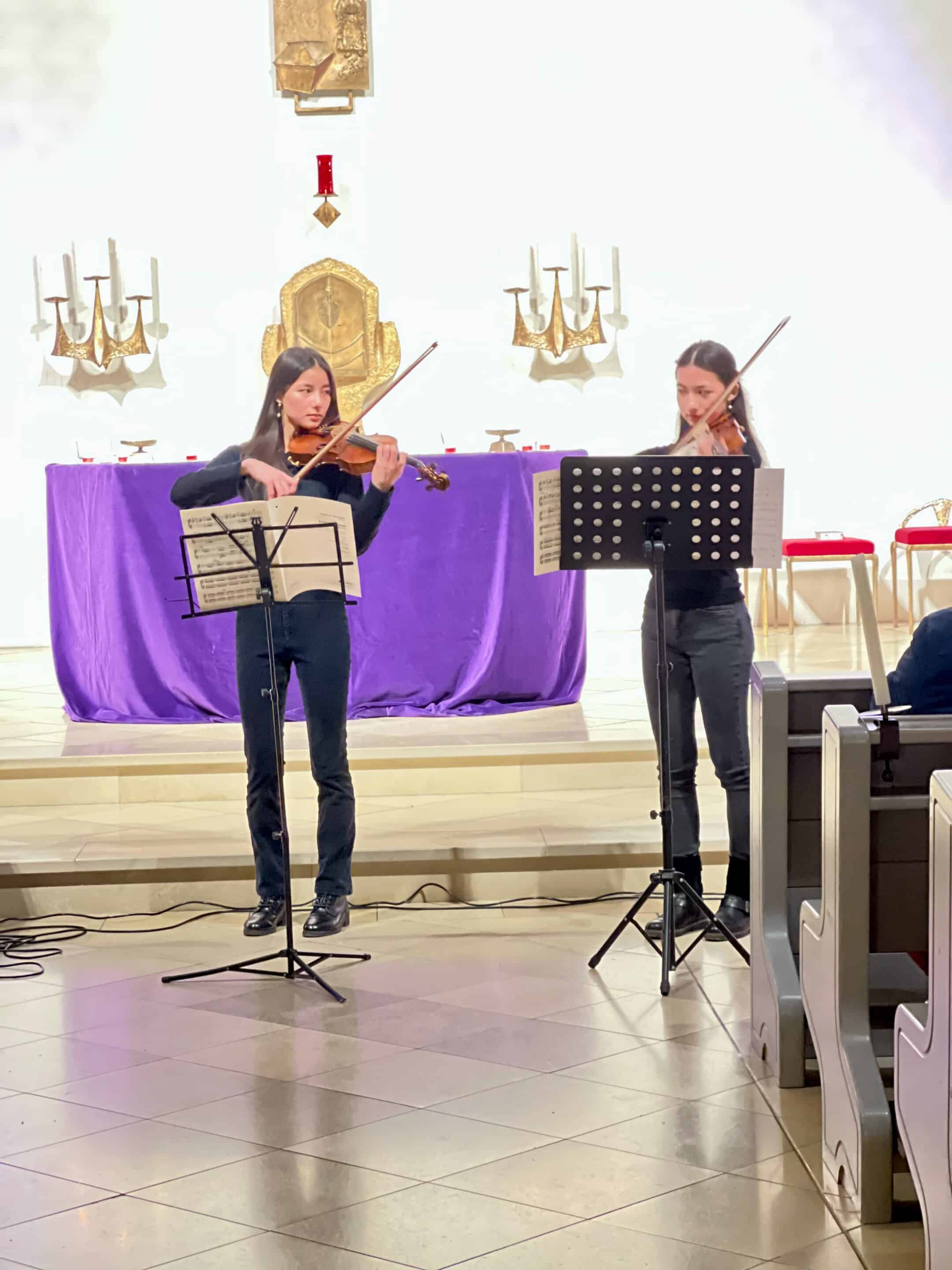 Zwischen den Programmblöcken erklang Instrumentalmusik, die von den Schwestern Rebecca und Helena Neu geboten wurde. Mit dem 1. Satz aus Vivaldis „Winter“ (Die vier Jahreszeiten) und dem 1. Satz aus dem Violinkonzert von Giovanni B. Viotti boten sich den Zuhörern Werke auf einem technisch-musikalischen Niveau, das man sonst in großen Konzertsälen vermuten würde. Rebecca mit dem Vivaldi und Helena mit Viotti meisterten nicht nur die virtuose Technik der beiden Stücke bravourös, sondern loteten mit ihren Geigen jede mögliche Klangnuance ihrer Instrumente aus.