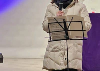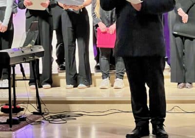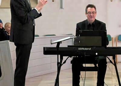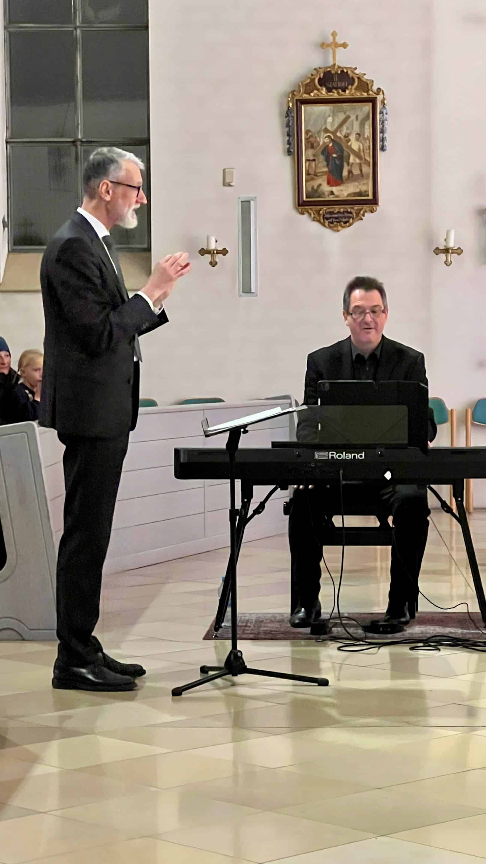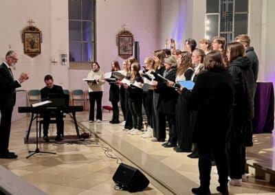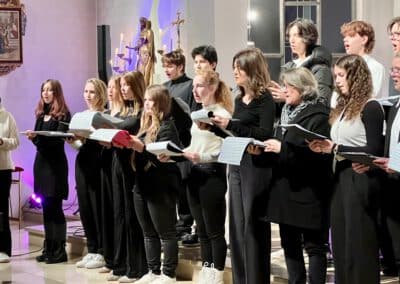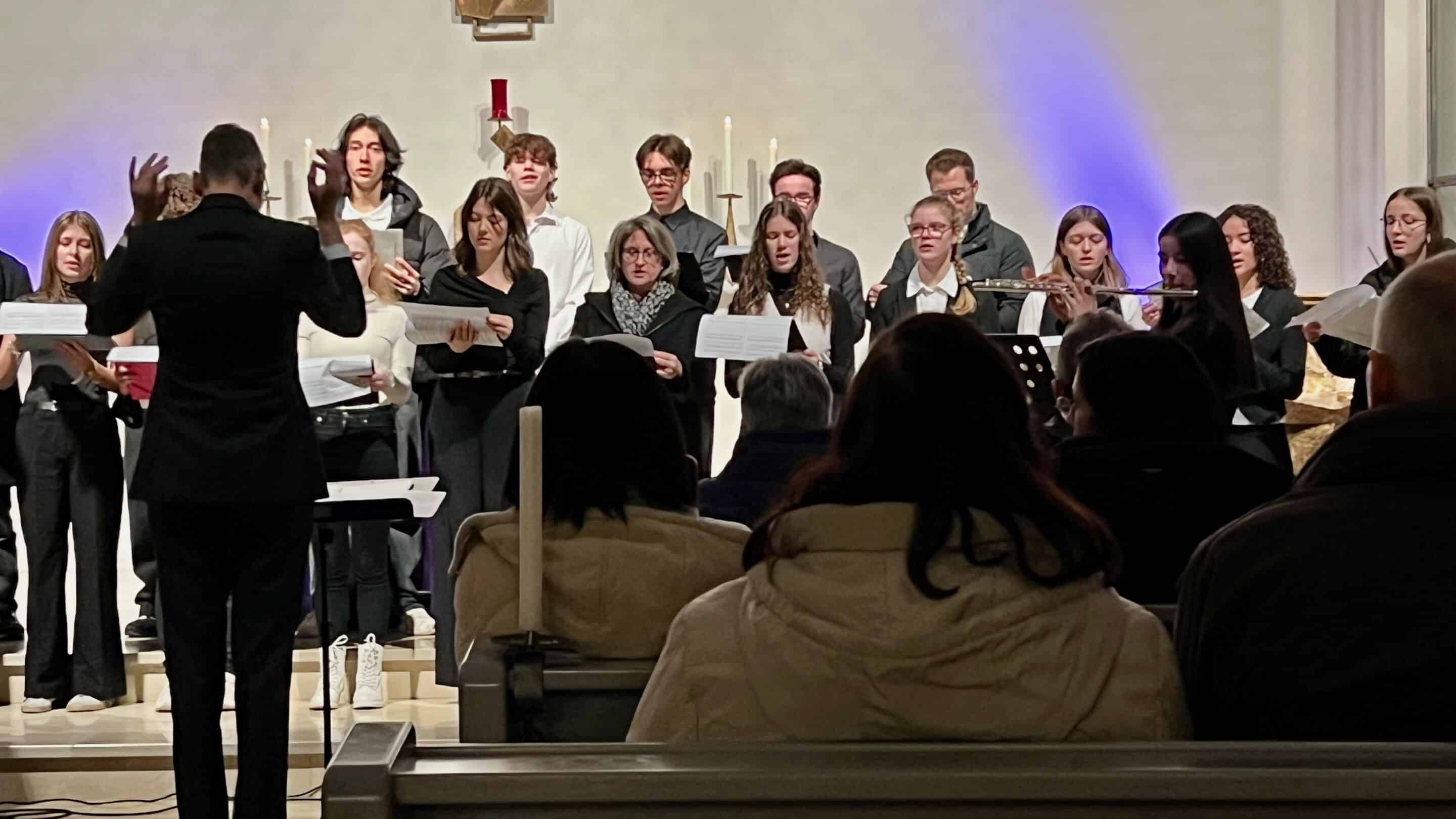 Den letzten Programmteil eröffneten Rebecca und Helena Neu im wohlklingenden Duett mit dem 1. Satz aus dem barocken „Weihnachtskonzert“ von Francesco Manfredini gefolgt vom berühmten Chorstück „Ave maris stella“ von Edward Grieg. Wolfram Buchenbergs Arrangement des hebräischen Lieds „Hine ma tow“ führte die innigen Klänge des Chors mit der von Helena Neu gespielten Querflöte und dem Klavier zusammen.